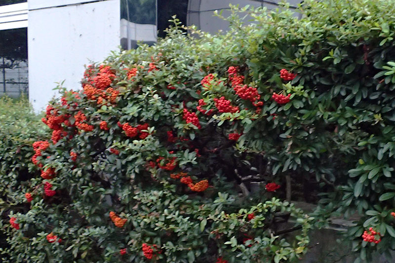 ピラカンサの実が赤く色づいてきました。おいしそうに見えますが、年明けごろに他の木の実がなくなると、ようやく鳥が食べにきます。