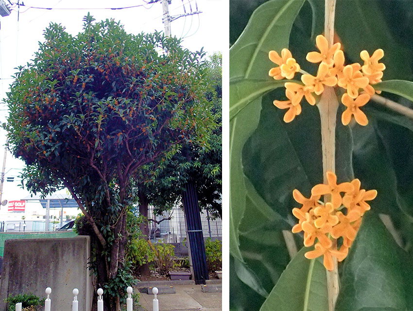 通用門(西門)横にあるキンモクセイの花が咲きました。花の香りが漂っています。