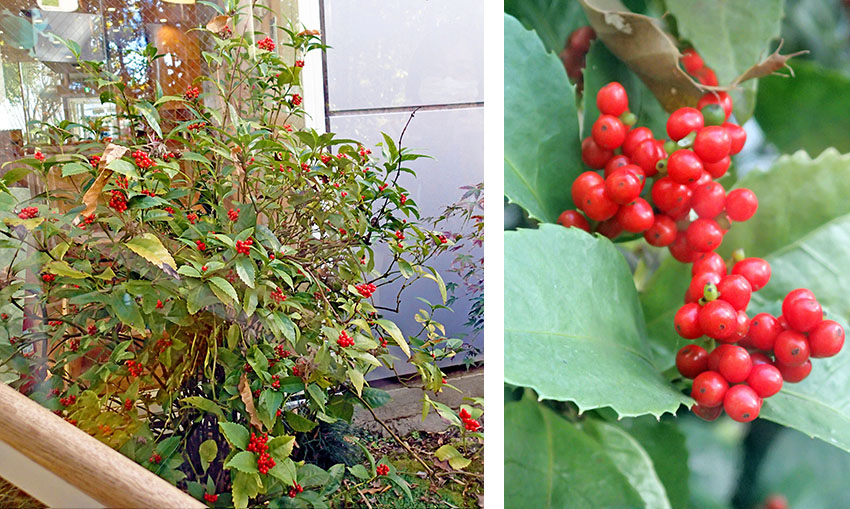 センリョウが赤く色づきました。他の木の実がなくなるころ鳥が食べに来ます。