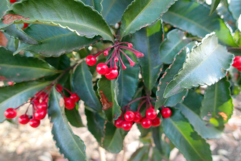 センリョウが赤く色づきました。他の木の実がなくなるころ鳥が食べに来ます。