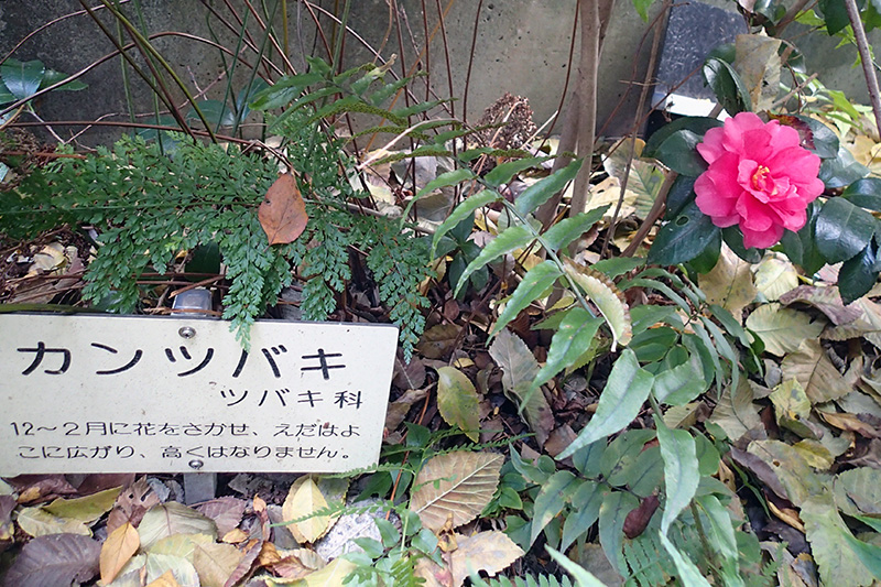 カンツバキの花が咲き始めました。ツバキとつきますが、サザンカのように花びらが1枚ずつ散ります。