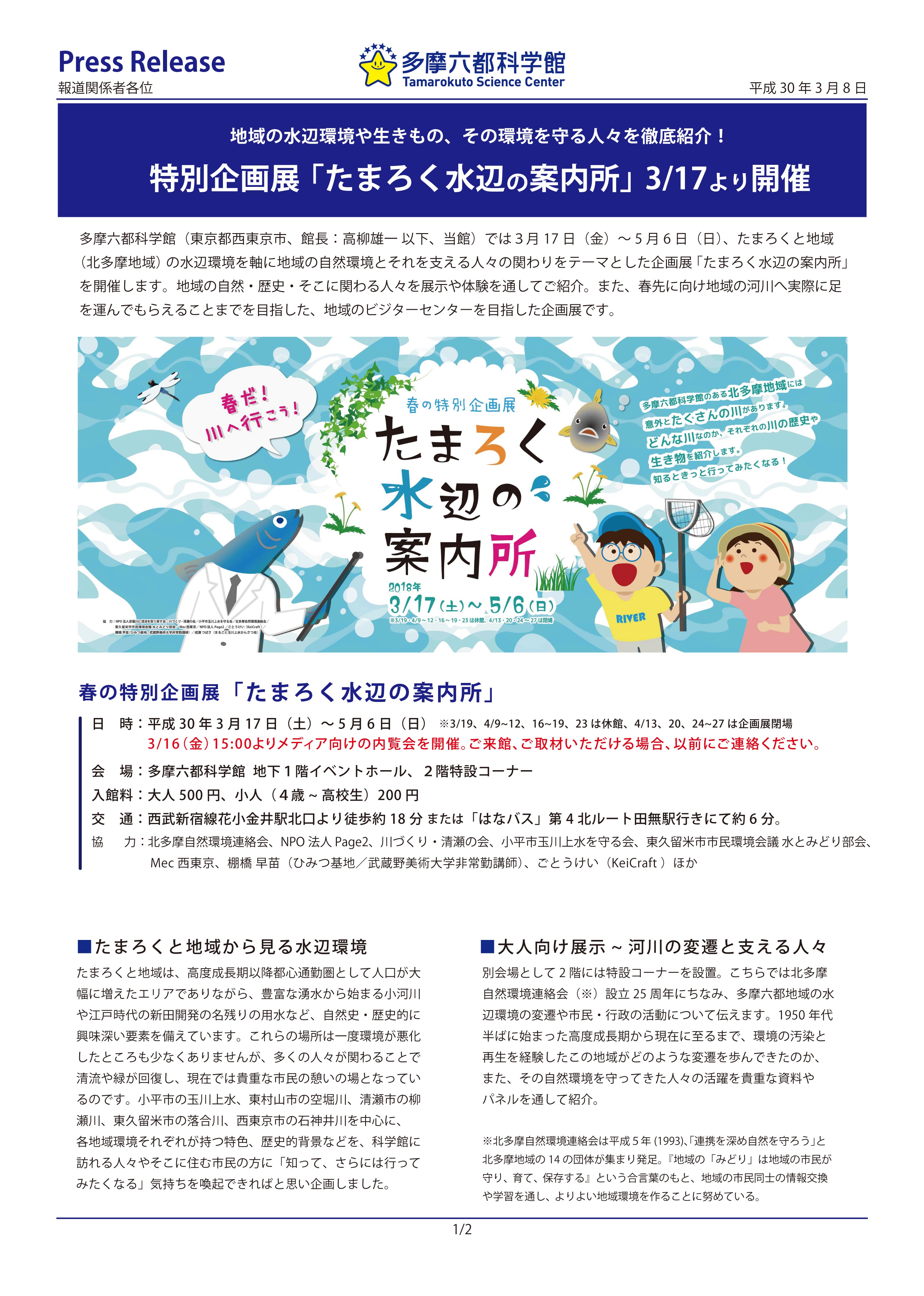 多摩六都科学館では3月17日(土)~5月6日(日)、たまろくと地域(北多摩地域)の水辺環境を軸に、地域の自然とそれを支える人々の関わりをテーマとした企画展「たまろく水辺の案内所」を開催します。地域の自然・歴史・そこに関わる人々を展示や体験を通してご紹介。また、春先に向け地域の河川へ実際に足を運んでもらえることを目指した、いわば地域の「ビジターセンター」となる企画展です。