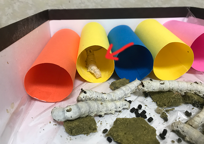 そうすると、本当に黄色の筒の中で糸を吐きはじめたカイコがいました。