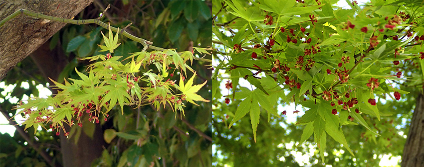 また、新芽が開く時期に花が咲く木もあります。下はイロハモミジ。葉の下にある赤っぽいものが花です。