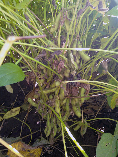 タチナガハの株(コンバイン収穫しやすいよう下の方に豆が生るよう品種改良されています)