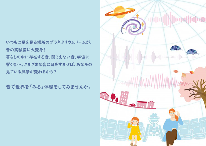 プラネタリウムというと普通は星を「みる」場所ですが、今回は「きく」ことにスポットをあてた実験的なイベントを開催しました。実は、多摩六都科学館のプラネタリウムドームの音響はサラウンドシステムと言ってスピーカー8個(+低い音用2個)が大きなドームを囲むように並んでいます。それぞれのスピーカーから音が出ると、音に囲まれ、臨場感を感じることができます。さらに、ドームは天井が丸いので音の反響が複雑です。こんな特殊な環境で音の実験に挑戦しました。