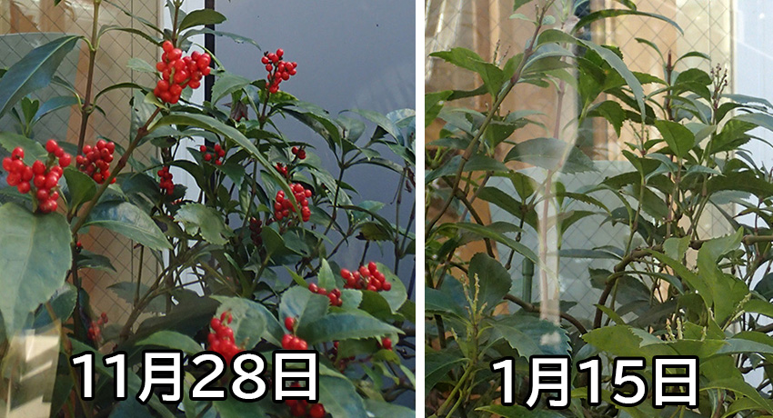 実がなくなった後もセンリョウとマンリョウの違いが見られます。