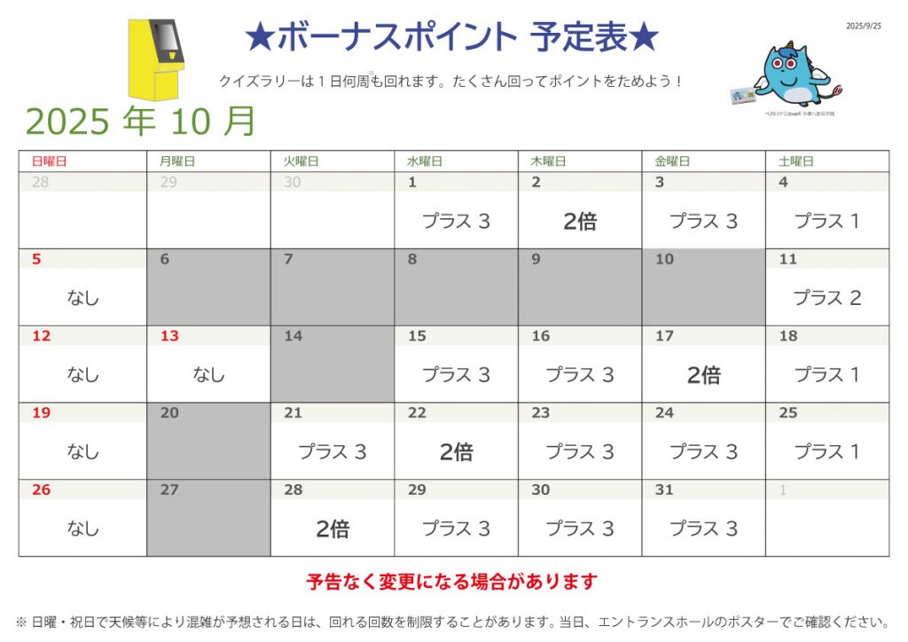 クイズラリーからのおしらせ 10月の予定 2025/10/1 クイズラリー, 新着情報, 科学館からのお知らせ いつもクイズラリーをご利用いただきありがとうございます。 10月の予定は以下の通りです。 回数制限は原則なしとなりました。 変更がある場合は、当日エントランスホールのポスターでお知らせしますので ご確認ください。